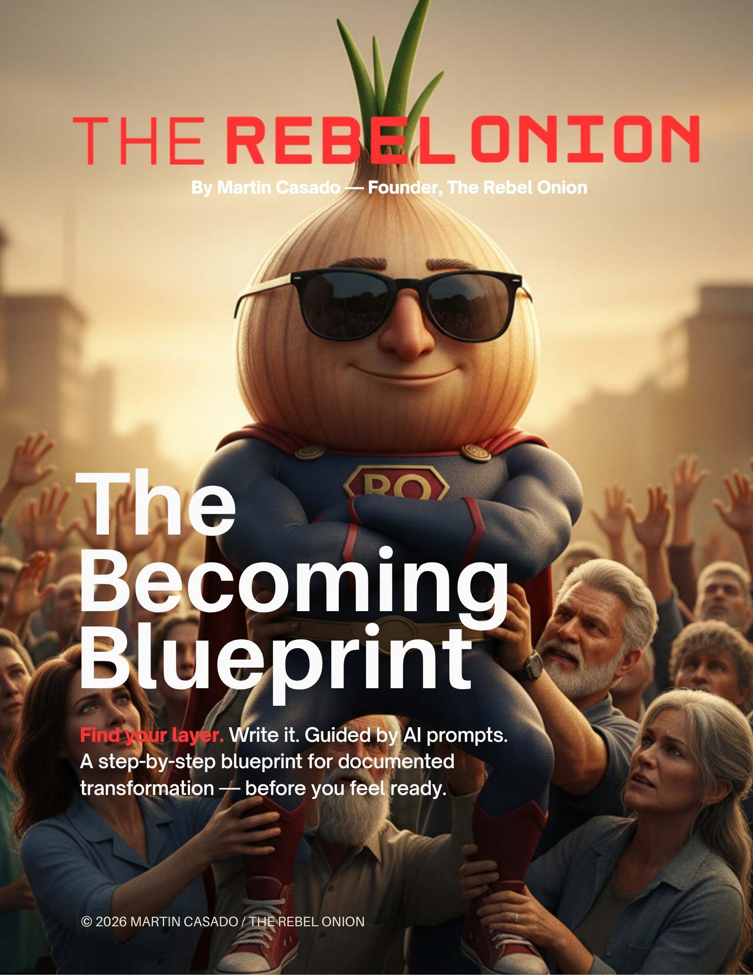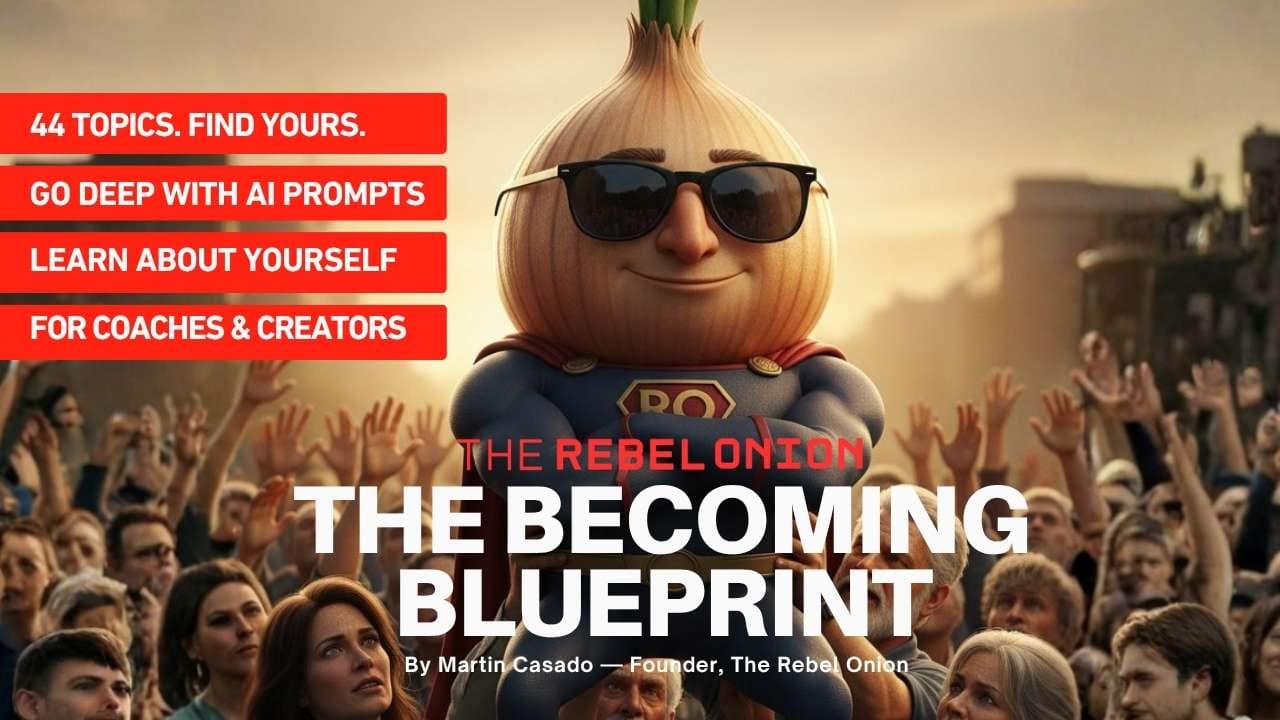 The Becoming Blueprint is the framework I wish I had when I started peeling. Forty-four named transformation layers, six deep-dive stories, copy-paste AI prompts, and a 12-week arc for turning your layer into content — published or not.