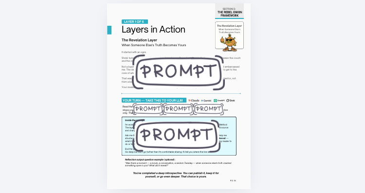 Thirty pages. Forty-four named transformation layers — each one pulled from real life, not theory. Six featured layers with full personal stories, copy-paste AI prompts, reflection questions, and a 12-week arc for turning your layer into content.